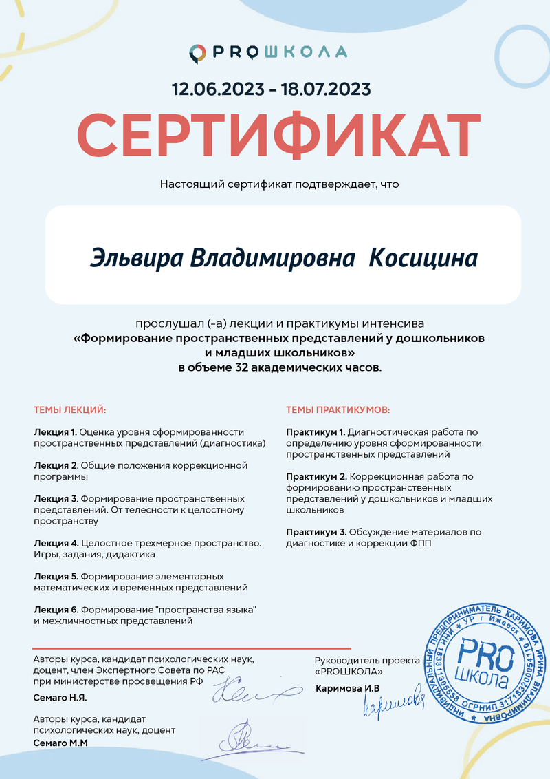 · 18.07.2023 год — Курс «Формирование пространственных представлений у дошкольников и младших школьников».